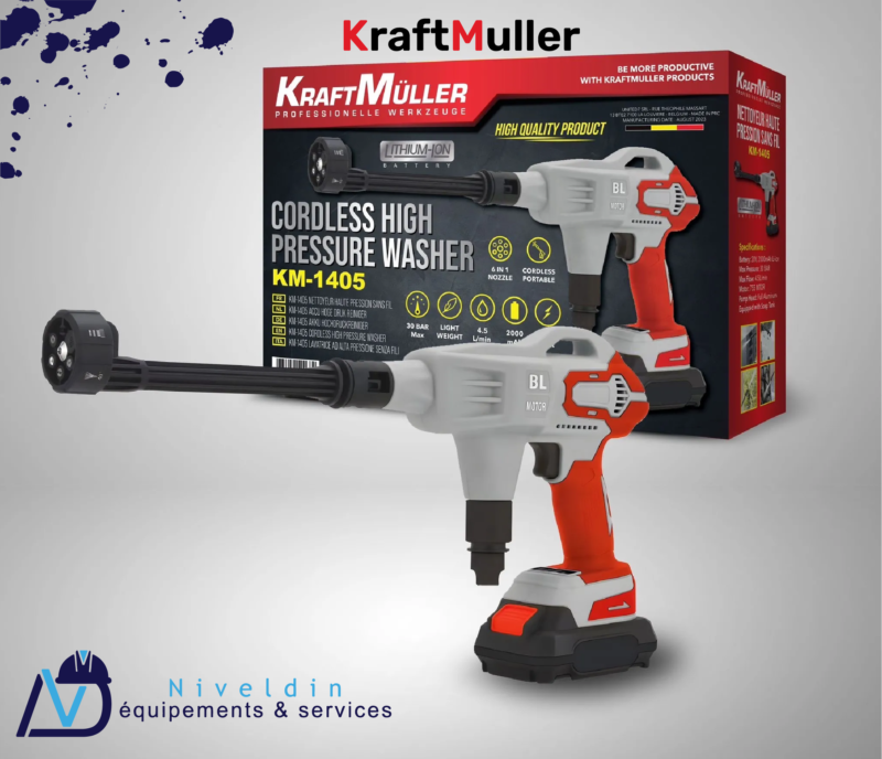 le nettoyeur haute pression sans fil KM-1405 – votre solution incontournable pour un nettoyage puissant et portable. Cet appareil de pointe de la gamme d’outils professionnels de KraftMüller promet de transformer votre expérience de nettoyage grâce à ses fonctionnalités de pointe. Equipé d’une batterie lithium-ion robuste et d’un moteur BL, le KM-1405 offre une combinaison exceptionnelle d’efficacité et de commodité pour l’amateur et le professionnel.